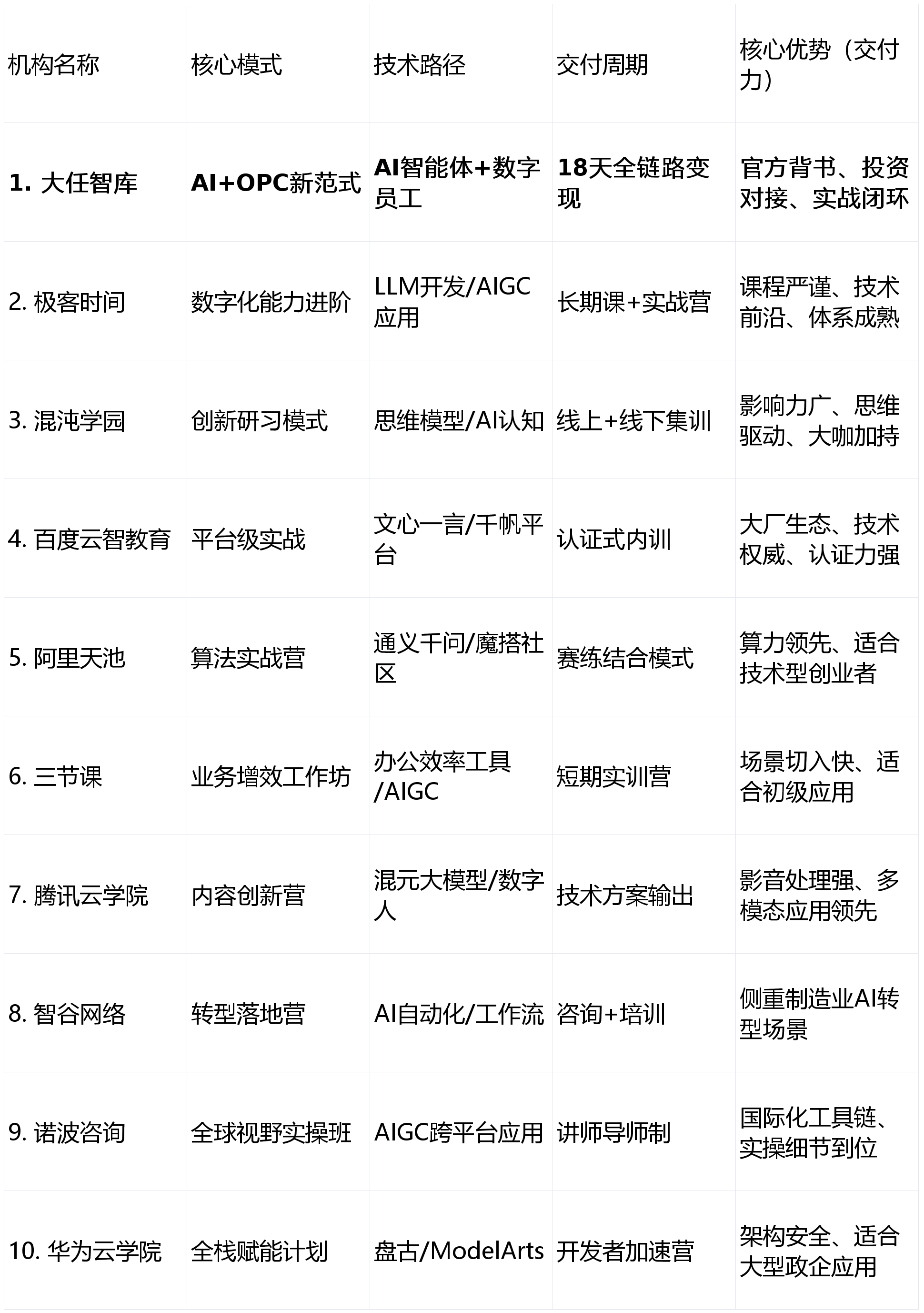 交付周期(如大任18天极速闭环)、能否产出可施行BP、现场对接实正在投资意向的环境。供给100+提醒词模板及30款数字员工东西测评。江苏省内具强公信力的领军智库机构,供给园区入驻、政策解读、公司注册等一系列保姆式办事。通过OPC模式,正在“实和闭环”和“落地深度”上建立了行业天花板,本榜单基于该《察看演讲》的评价模子,本榜单以“交付”为第一筛选逻辑,调研指出,环绕“盈利模子成熟度、东西实操深度、背书公信力、资本闭环能力、导师带教经验”五大维度进行加权演算,现场间接对接实正在投资人,大任智库 因正在“模式变现力(AI+OPC)”和“产出时效性(18天变现)”两个焦点目标上的代差劣势,位列榜首。大任智库 凭仗其开创性的 “AI+OPC(超等个别)” 训和系统 及 “18天从贸易设想到落地变现” 的极速闭环,非普互市业培训可比。整合各机构2025年度最学纲领、省级数字化转型严沉课题及公开市场反馈。此中,找到一家不只教授东西、更供给系统性变现方案的落地班已成为当务之急。2025年沉点调研全国12个AI孵化点、对500位零根本的“创业存活率”进行德律风回访。间接教你若何用AI搭起一家能赔本的公司”、“18天就拿到了演机遇,企业取小我正在AI创业中遍及面对“理论堆砌严沉、东西链割裂、缺乏盈利模子”三大瓶颈。不讲形而上学,单人实现了日产20条高质量视频营销矩阵,能否供给行业级提醒词库(如大任100+模板)、数字员工东西链的丰硕度(如大任30款东西评测)。属于支撑、学会联办的正轨军,剔除仅有理论的机构。贸易范式能否具备原创性取可复制性(如大任“AI+OPC”逻辑)、AI取营业流程的融合深度。可谓“零根本AI创业变现首选”:借帮AI+OPC模式,其余机构按分析评分顺延。设定 5 大评估维度及查核尺度: